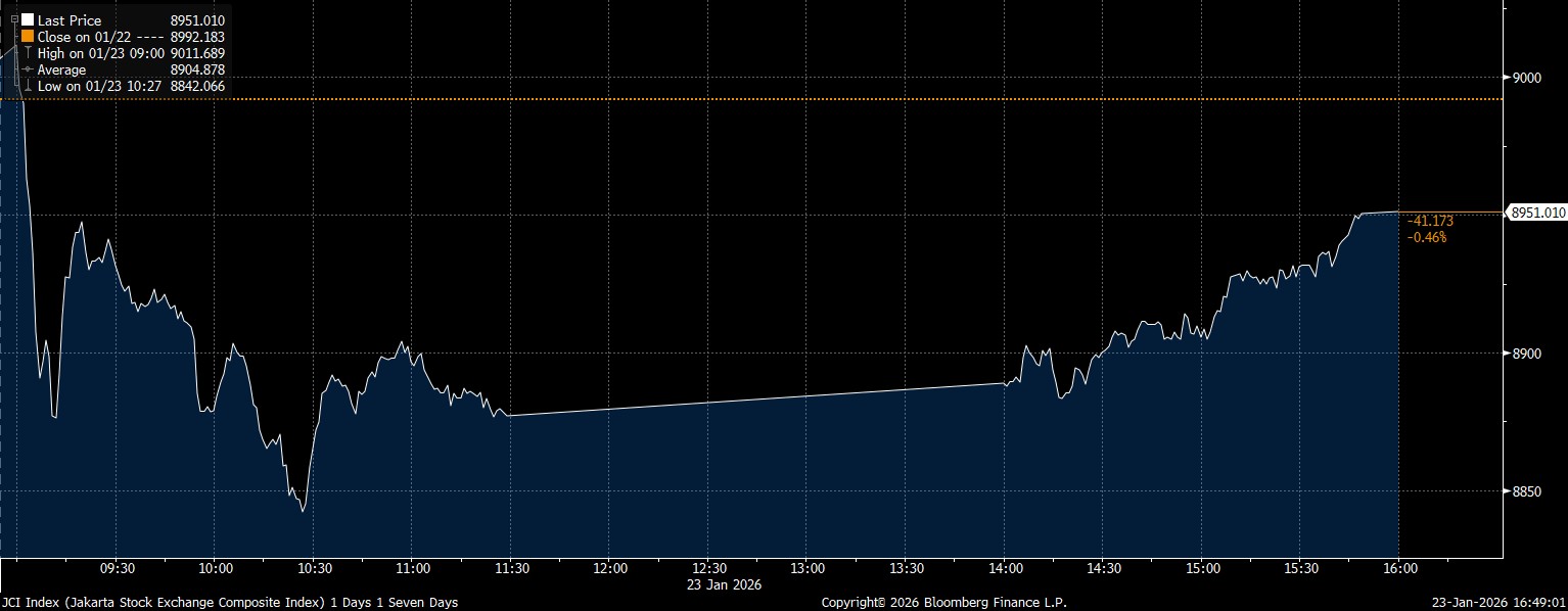Bloomberg Technoz, Jakarta - Indeks Harga Saham Gabungan (IHSG) akhirnya ditutup melemah 41,17 poin atau setara 0,46% ke level 8.951 pada penutupan Sesi II siang hari ini, Jumat (23/1/2026). IHSG sempat menyentuh level terendah hingga 8.837 dengan angka pelemahan nyaris mencapai 2%. Adapun level tertinggi pada 9.039.
