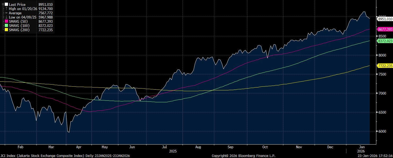 Sentimen hari ini tertuju terhadap sikap Presiden AS Donald Trump yang membatalkan tarif perdagangan tambahan terhadap negara–negara Eropa yang dianggap menentang keinginannya untuk memiliki Greenland. Presiden Trump mengatakan telah mencapai kesepakatan kerangka kerja dengan NATO.