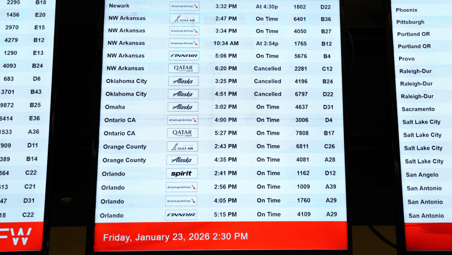 Bandara Internasional Dallas-Fort Worth akan menjadi salah satu yang paling terdampak dengan lebih dari 60% penerbangan terjadwal ke dan dari bandara tersebut dibatalkan untuk Sabtu, menurut data dari penyedia analitik penerbangan FlightAware.