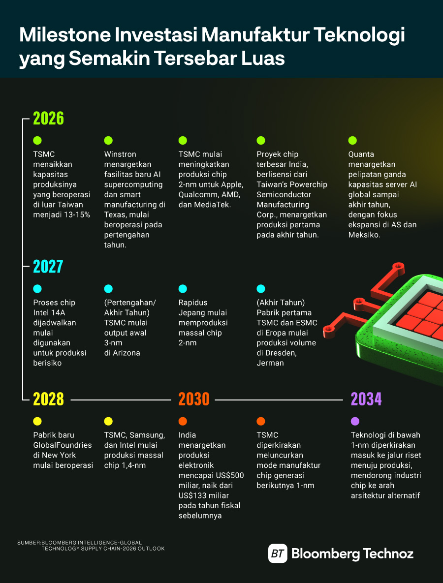 Melansir Bloomberg Intelligence lewat laporan berjudul Global Technology Supply Chain-2026 Outlook, diversifikasi manufaktur elektronik global mulai menjauh dari China. Ini sudah berlangsung sejak satu dekade lalu, dan makin dipercepat lantaran ada perang dagang AS-China, pandemi Covid-19, serta meningkatnya risiko geopolitik.