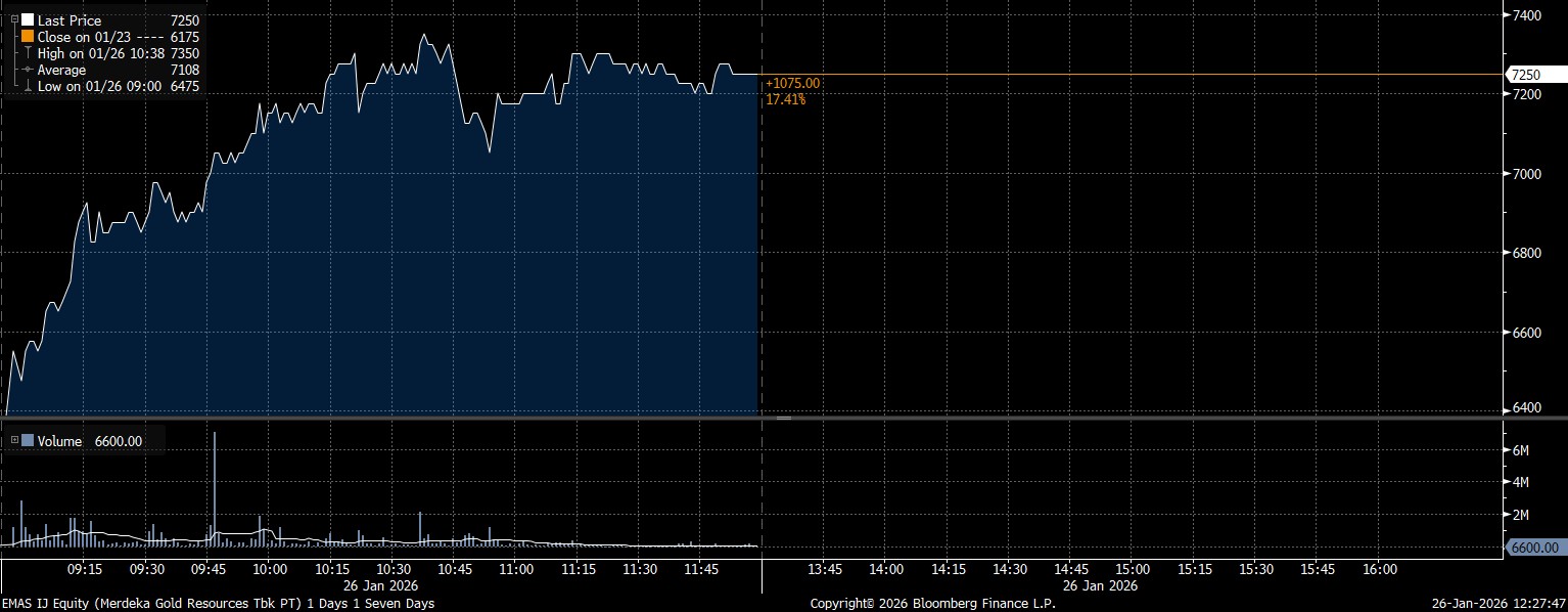 - PT Merdeka Gold Resources Tbk (EMAS) menguat 17,41% di posisi Rp7.250