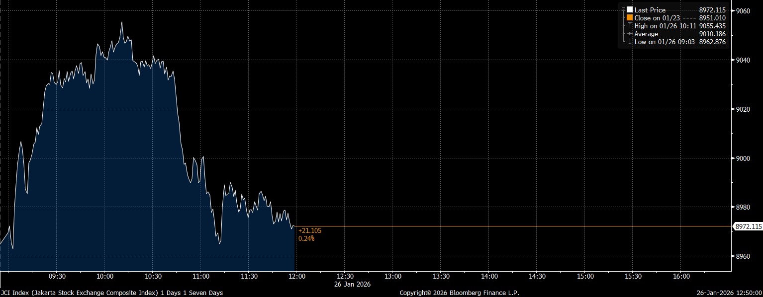 Bloomberg Technoz, Jakarta - Indeks Harga Saham Gabungan (IHSG) berhasil menguat 0,24% di posisi 8.972,11 pada perdagangan Sesi I, Senin (26/1/2026) dengan penguatan saham EMAS, ANTM, juga DSSA jadi penopang.