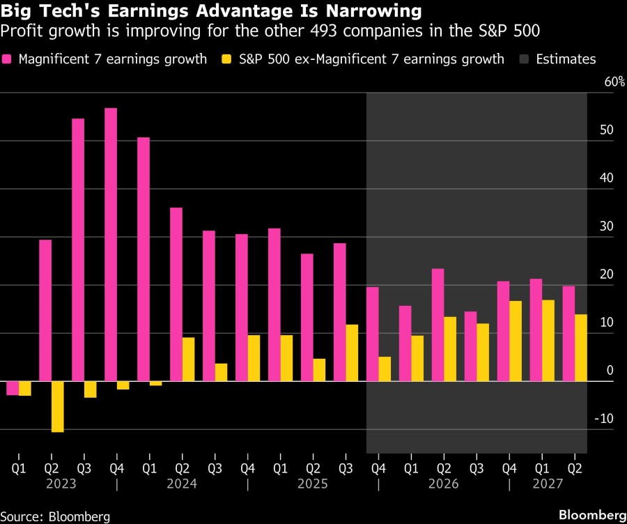 Selain itu, kemungkinan besar banyak pemegang saham tidak akan ingin keluar dari Mag7 mengingat kemampuannya untuk menghasilkan keuntungan lebih cepat daripada pasar lainnya. Dari 493 perusahaan di S&P 500 yang tidak termasuk dalam Magnificent Seven, diperkirakan akan mencatatkan pertumbuhan laba sebesar 8% pada kuartal keempat, menurut Bloomberg Intelligence, yang jauh lebih lambat daripada yang diharapkan dari Big Tech.