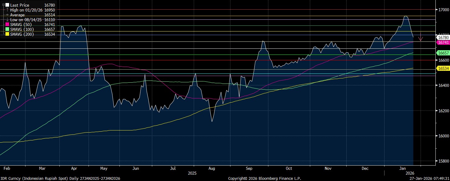 Terbatasnya laju penguatan rupiah pada perdagangan hari ini lantaran sentimen itu sudah nampak pada pembukaan pasar kontrak Non-Deliverable Forward (NDF). Pagi ini (27/1/2026), rupiah dibuka melemah 0,01% ke posisi Rp16.754/US$ lalu kembali susut 0,03% ke posisi Rp16.757/US$.