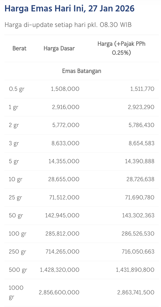 Pada Selasa (27/1/2026), emas Antam dihargai Rp 2.916.000/gram. Melemah Rp 1.000 dari posisi kemarin.