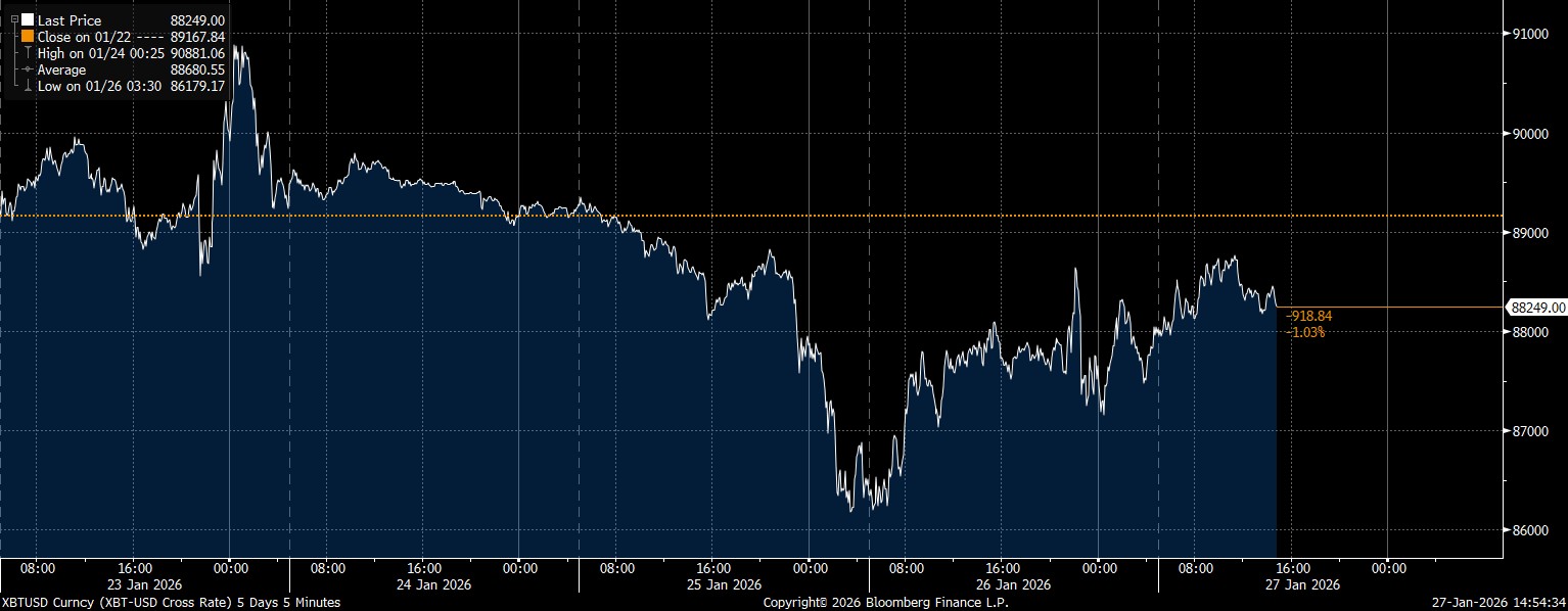 Bitcoin tercatat melandai dengan pergerakan yang amat terbatas di harga US$88.000–an (Rp1,48 miliar), sepanjang 2026 hanya menguat terbatas 0,81%, yang tergambar stagnan lajunya.