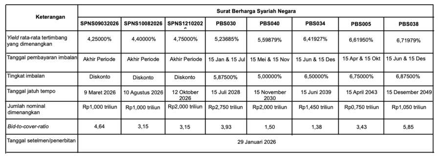Lelang yang masuk pada sukuk/SBSN Selasa 27 Januari 2026, pemerintah memenangkan Rp12 triliun. (DJPPR)Meski penawaran menyusut, lelang sukuk kemarin relatif solid dengan rasio bid-to-cover di rentang 1,5% hingga 5,85%. Artinya, permintaan tetap melampuai jumlah yang diserap pemerintah.