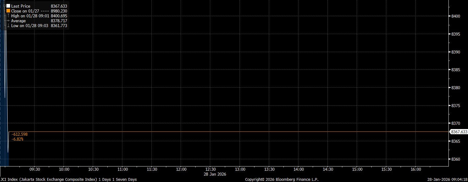 Bloomberg Technoz, Jakarta - Indeks Harga Saham Gabungan (IHSG) pada perdagangan hari ini, Rabu (28/1/2026), dibuka melemah amat dalam. Pada pukul 9.01, indeks kehilangan 586,71 poin atau setara dengan melemah 6,53% ke level 8.393.