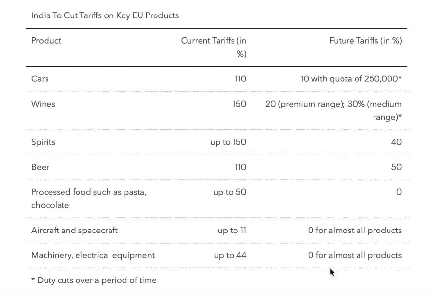 Perjanjian ini diperkirakan akan menggandakan ekspor barang Uni Eropa ke India pada 2032, setelah New Delhi setuju menghilangkan atau mengurangi tarif pada 96,6% pengiriman, menurut siaran pers Komisi Eropa. Kementerian Perdagangan dan Industri India mengatakan Uni Eropa, pada gilirannya, akan menghilangkan atau mengurangi tarif pada 99,5% barang impor dari India dalam tujuh tahun.