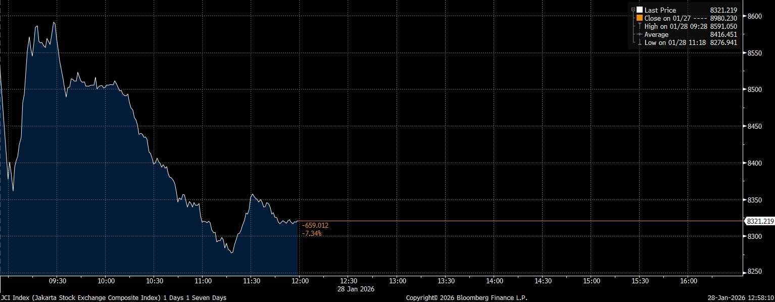Bloomberg Technoz, Jakarta - Indeks Harga Saham Gabungan (IHSG) pada perdagangan siang hari jeda Sesi I Rabu (28/1/2026), mencatatkan pelemahan yang amat dalam mencapai ambles 7,34% di posisi 8.321.