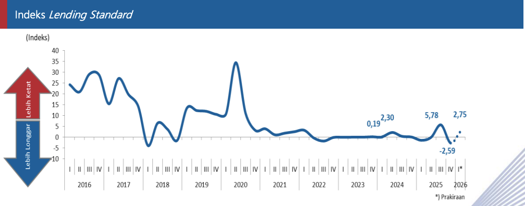 Tidak hanya likuiditas yang amat memadai, perbankan juga sebenarnya sudah cukup longgar dalam persyaratan pemberian kredit (lending requirement). Ini terlihat dari indeks Lending Standard yang pada kuartal IV-2025 berada di -2,59.Jauh lebih rendah ketimbang kuartal sebelumnya yang mencapai 5,78.