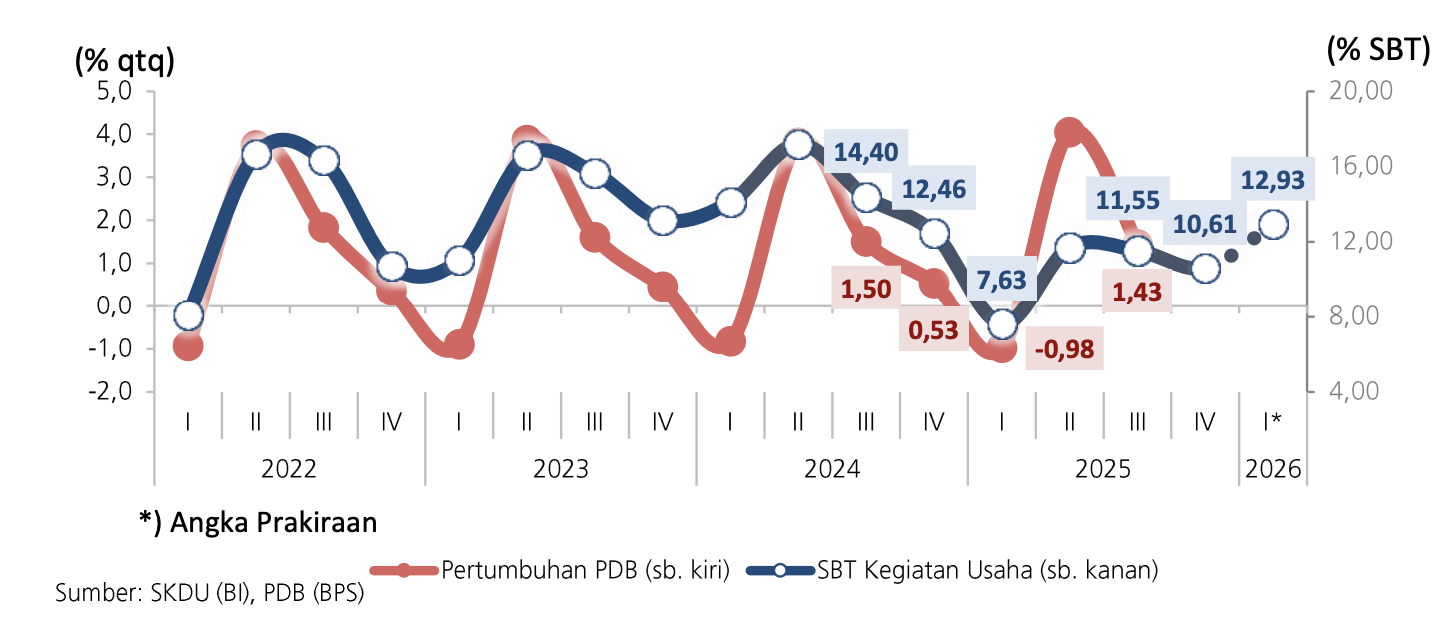 Kehatian-hatian dunia usaha dalam ekspansi terlihat dari Saldo Bersih Tertimbang (SBT) yang lebih rendah. Pada kuartal IV-2025, SBT berada di 10,61%. Ini menjadi yang terendah dalam tiga kuartal terakhir.