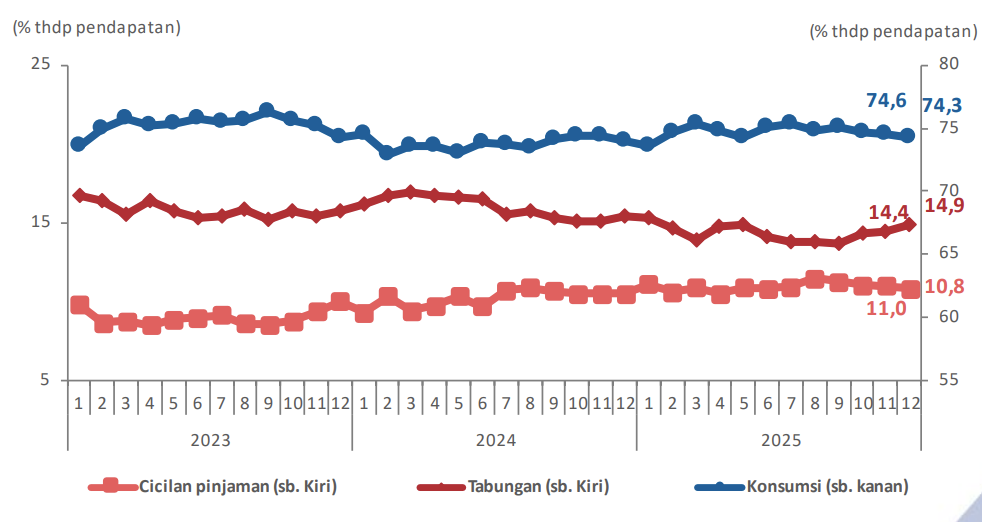 Per Desember 2025, porsi penghasilan yang dialokasikan untuk konsumsi adalah 74,3%. Ini menjadi yang terendah sejak Mei 2025 atau tujuh bulan terakhir.