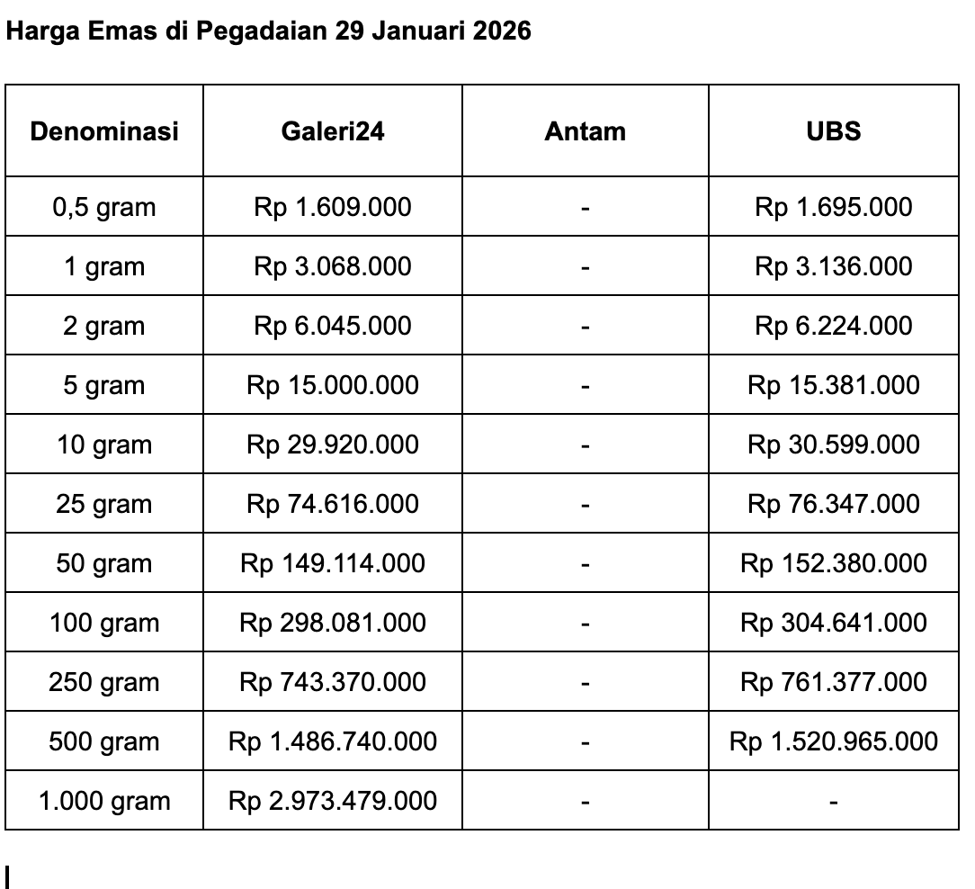 Lalu untuk emas batangan Galeri 24 ukuran 0,5 gram, Pegadaian menjual di harga Rp 1.609.000. Bertambah Rp 54.000 dalam sehari.