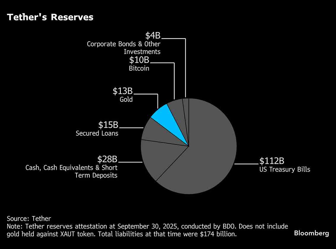 Tether menghasilkan uang dari stablecoin dolar miliknya, yang merupakan raksasa di sektor ini, dengan US$186 miliar yang beredar. Perusahaan menerima dolar sungguhan sebagai imbalan untuk token USDT tersebut, dan menginvestasikannya dalam obligasi pemerintah dan aset lain seperti emas, menghasilkan miliaran dolar dari bunga dan keuntungan perdagangan.
