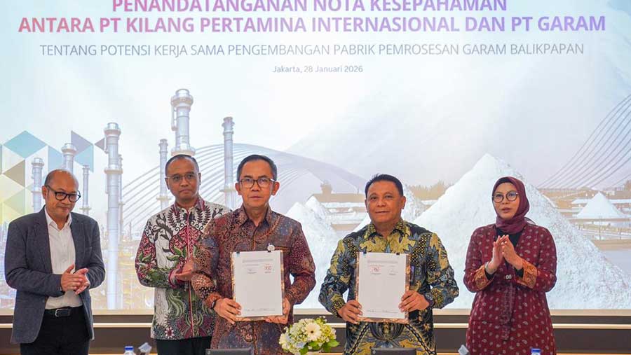 Bloomberg Technoz, Jakarta - Kilang Pertamina Internasional (KPI) terus memperkuat inovasi hilirisasi dengan menjajaki kerja sama produksi garam melalui pembangunan pabrik di Balikpapan bersama PT Garam. Nota kesepahaman (MoU) antara kedua perusahaan ditandatangani oleh Direktur Utama KPI Taufik Aditiyawarman dan Direktur Utama PT Garam, Abraham Mose, pada Rabu, 28 Januari. Inisiatif ini menjadi langkah strategis untuk mengurangi ketergantungan impor garam industri yang saat ini mencapai 64% dari total kebutuhan nasional.