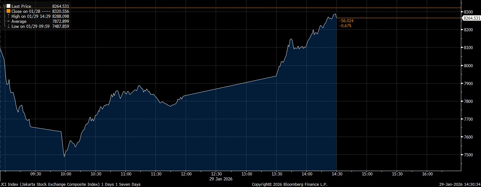 Bloomberg Technoz, Jakarta - Pelemahan IHSG menipis– biarpun masih ada di zona merah, melemah 56 poin (0,67%) di posisi 8.264 pada perdagangan Kamis (29/1/2026). Adapun IHSG sempat ambles hingga 10% pada perdagangan pagi hari tadi, dan sempat Trading Halt.