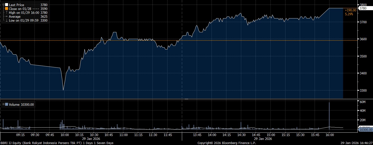 Bloomberg Technoz, Jakarta - Saham PT Bank Rakyat Indonesia Tbk (BBRI) berhasil menguat 190 poin atau melesat 5,29% ke level Rp3.780/saham pada penutupan perdagangan Kamis (29/1/2026).