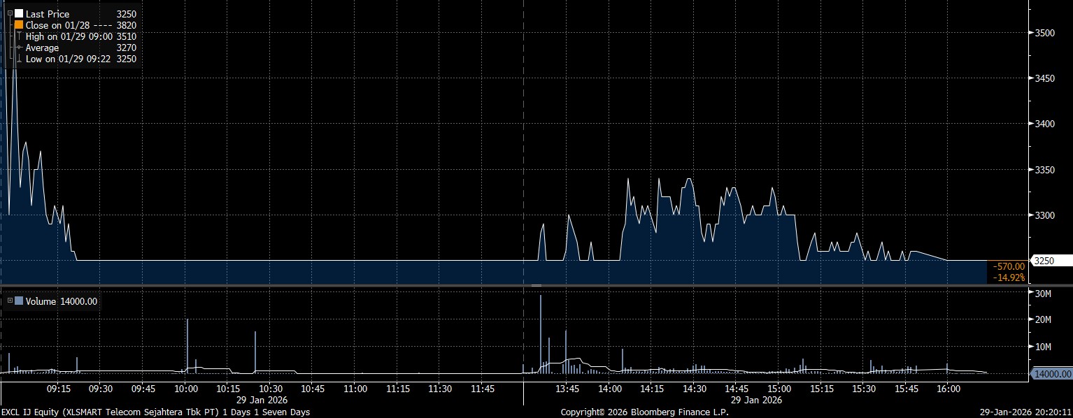 Sedang pada kesempatan yang sama, investor asing mencatat net buy terbesar pada saham PT XLSMART Telecom Sejahtera Tbk (EXCL) mencapai Rp188,84 miliar. Enggan terdorong tren pembelian, saham EXCL justru melemah 14,92% di posisi Rp3.250/saham.
