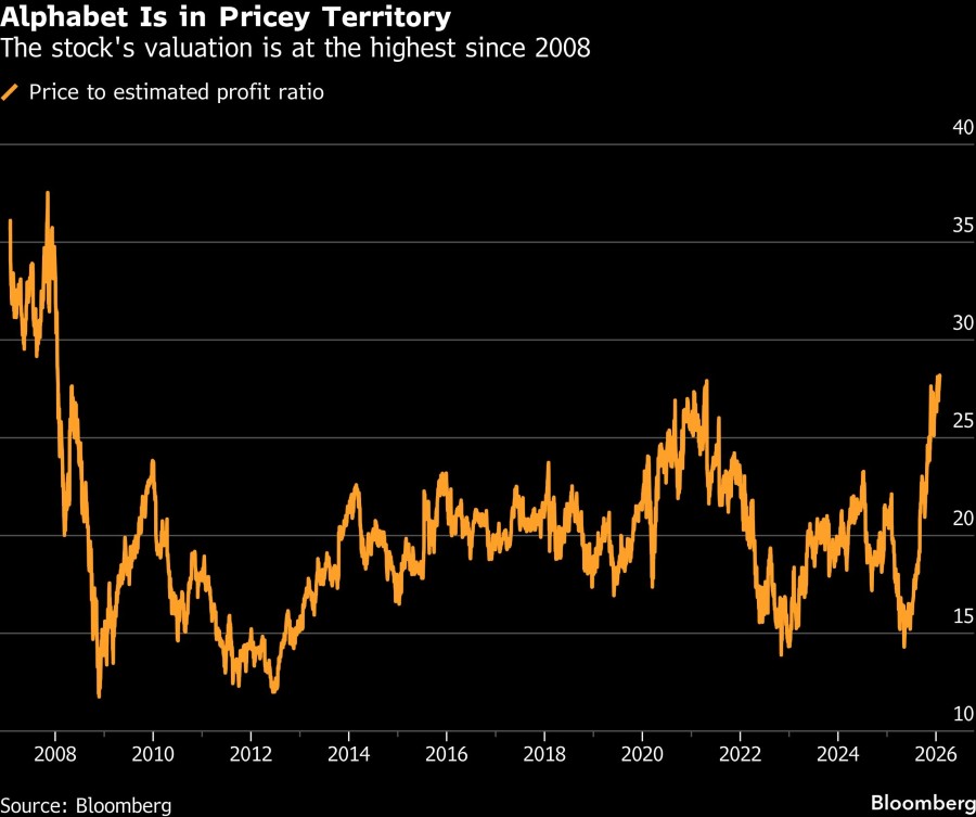 Saham Alphabet ditutup pada rekor tertinggi pada Kamis sebelum sedikit turun pada Jumat. Dengan rasio harga terhadap laba yang diperkirakan lebih dari 28 kali, saham tersebut diperdagangkan pada level tertinggi dalam hampir dua dekade.