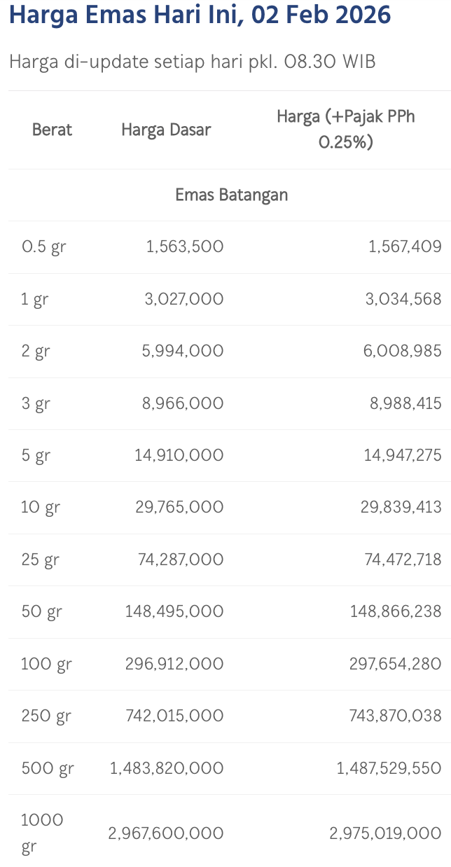 Pada Senin (2/1/2026), emas Antam dihargai Rp 3.027.000/gram. Menguat Rp 167.000 dari posisi perdagangan terakhir pada 31 Januari.