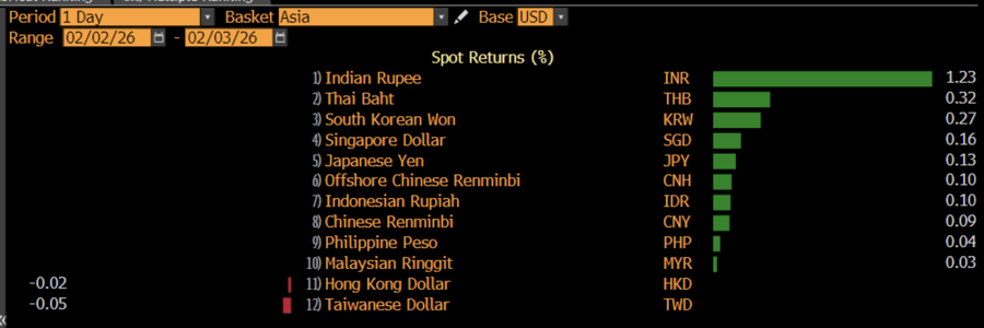 Pada perdagangan siang ini (3/2/2026), nilai tukar rupiah ikut terkerek dan menguat 0,10% ke Rp16.775/US$. Di zona hijau rupee India memimpin penguatan sebesar 1,26%, baht Thailand 0,39%, won Korea Selatan 0,30%, dolar Singapura 0,19%, yuan offshore China 0,11%, yen Jepang 0,10%, peso Filipina 0,06% dan ringgit Malaysia 0,05%.