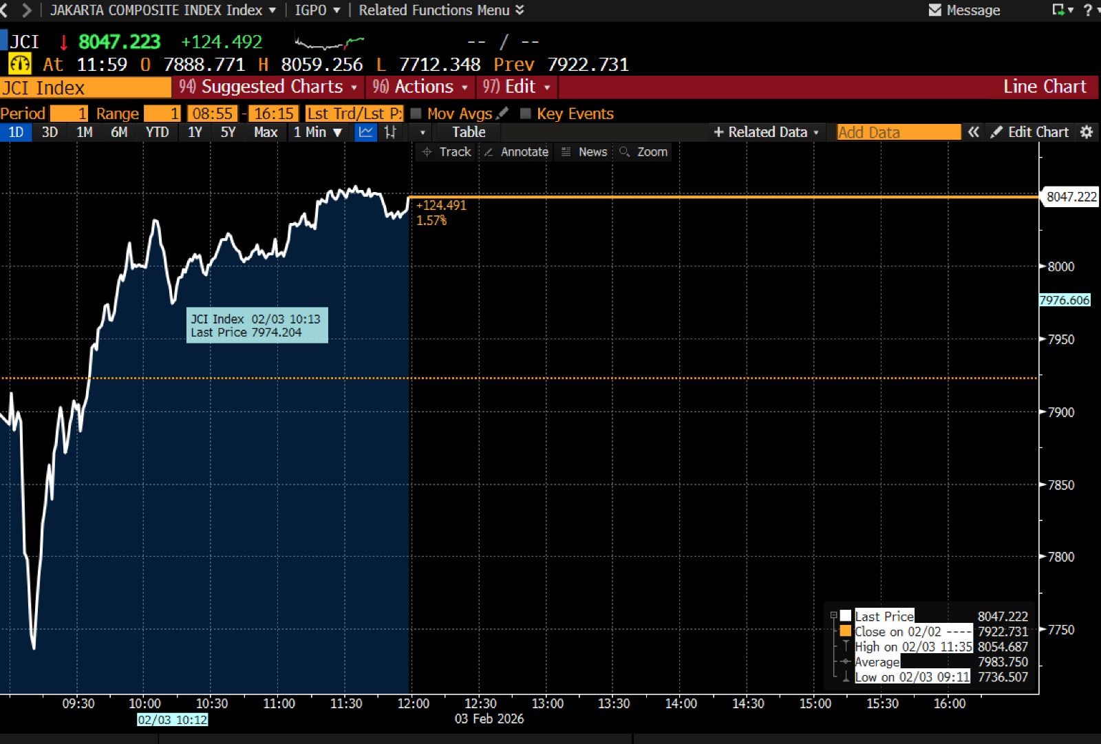 Pada Selasa (3/2/2026), IHSG menutup perdagangan Sesi I di posisi 8.047,22. Melonjak 1,57% dibandingkan hari sebelumnya.