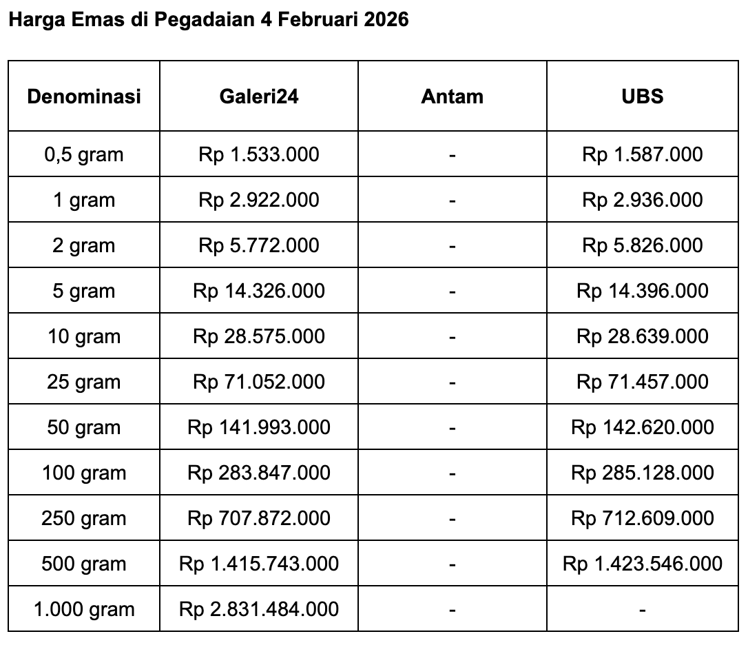 Lalu untuk emas batangan Galeri 24 ukuran 0,5 gram, Pegadaian menjual di harga Rp 1.533.000. Berkurang Rp 13.000 dalam sehari.