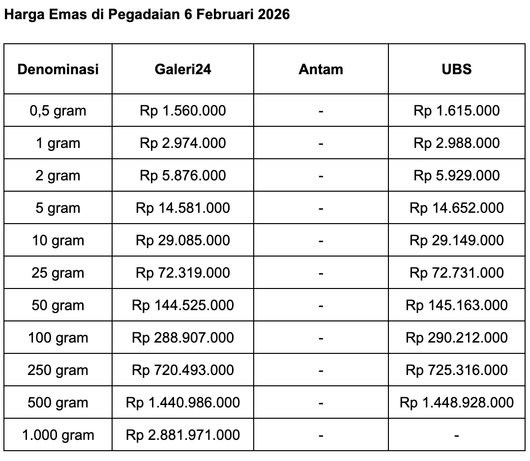 Adapun untuk ukuran 1 gram, harga emas Galeri 24 di Pegadaian adalah Rp 2.974.000. Terpangkas Rp 10.000 ketimbang harga kemarin.