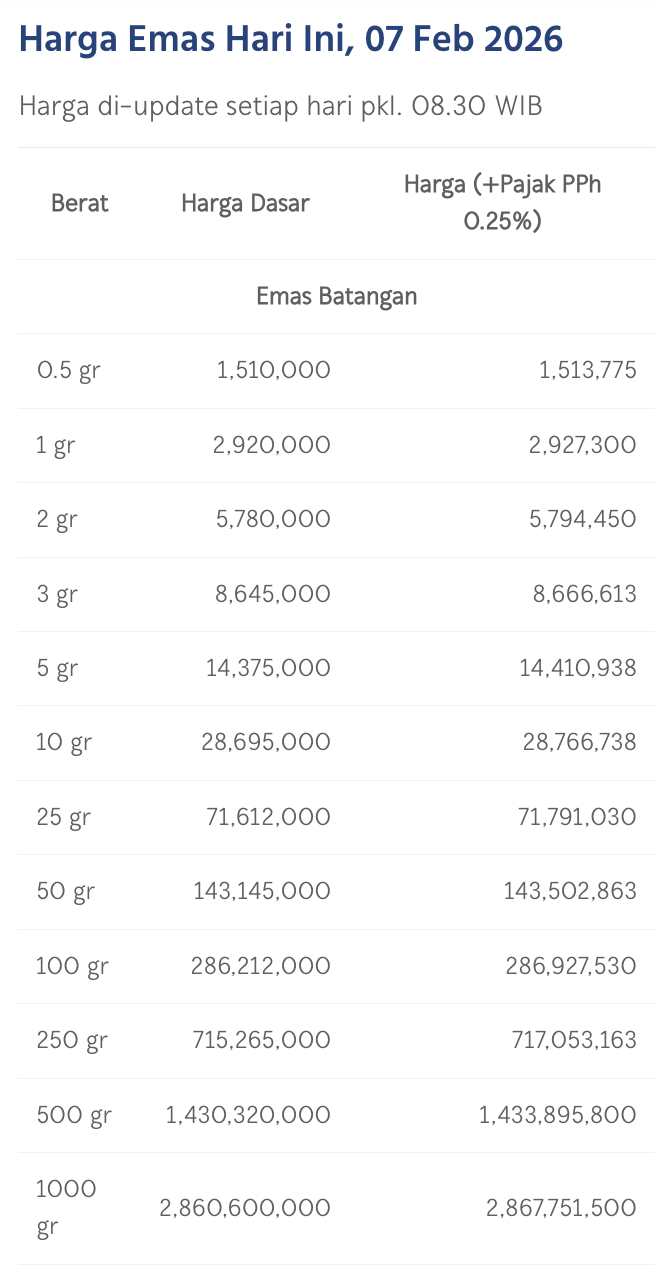 Pada Sabtu (7/2/2026), emas Antam dihargai Rp 2.920.000/gram. Naik Rp 30.000 dari posisi kemarin.