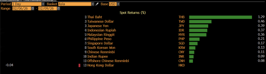 Sentimen serupa juga turut menopang yen Jepang yang bergerak menguat 0,39% dan stabil setelah kemenangan Perdana Menteri Jepang, Sanae Takaichi. Yen terapresiasi 0,6% ke JPY156,22/US$ setelah sebelumnya sempat melemah 0,3% ke JPY157,76/US$.