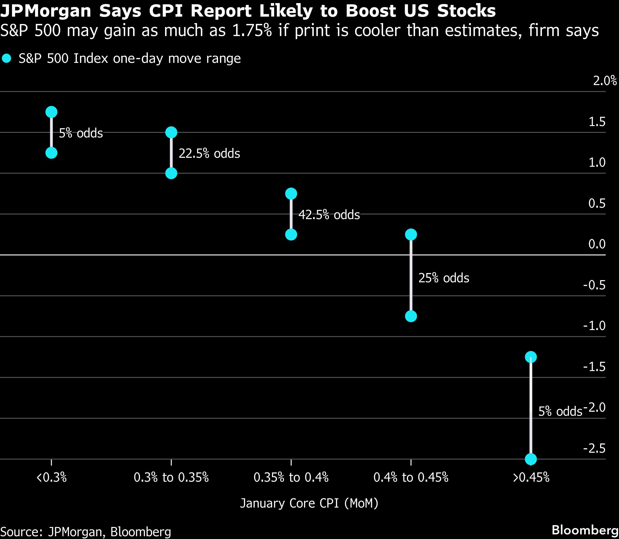 Jika indeks harga konsumen (CPI) inti AS mendekati atau di bawah perkiraan pada Jumat, meja perdagangan JPMorgan memperkirakan probabilitas 70% bahwa S&P 500 akan naik; dengan potensi reli sekitar 1,75% jika angka tersebut melambat jauh lebih besar dari proyeksi. Median ekonom yang disurvei Bloomberg memperkirakan CPI inti naik 0,3% dibanding bulan sebelumnya.