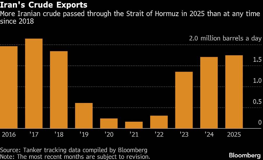 Iran juga bergantung pada transit melalui Selat Hormuz untuk ekspor minyaknya. Menurut data pelacakan kapal yang dikompilasi Bloomberg, lebih banyak minyak mentah Iran dikirim melalui jalur air tersebut pada tahun 2025 dibandingkan periode mana pun sejak 2018.