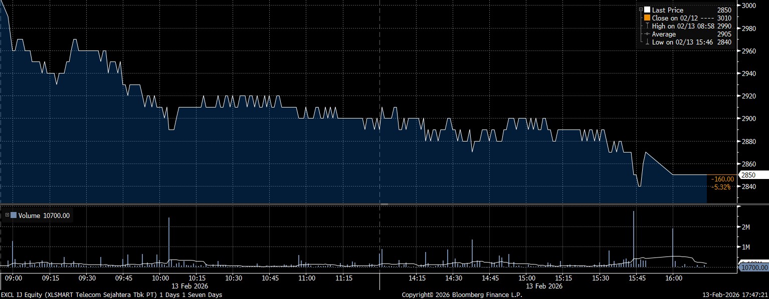 Bloomberg Technoz, Jakarta - Indeks Harga Saham Gabungan (IHSG) ditutup melemah 0,64% di posisi 8.212,27 pada perdagangan Jumat (13/2/2026). IHSG terpeleset sejak pagi hari tadi dengan saham XL SMART Telecom Sejahtera (EXCL) jadi pemberat.