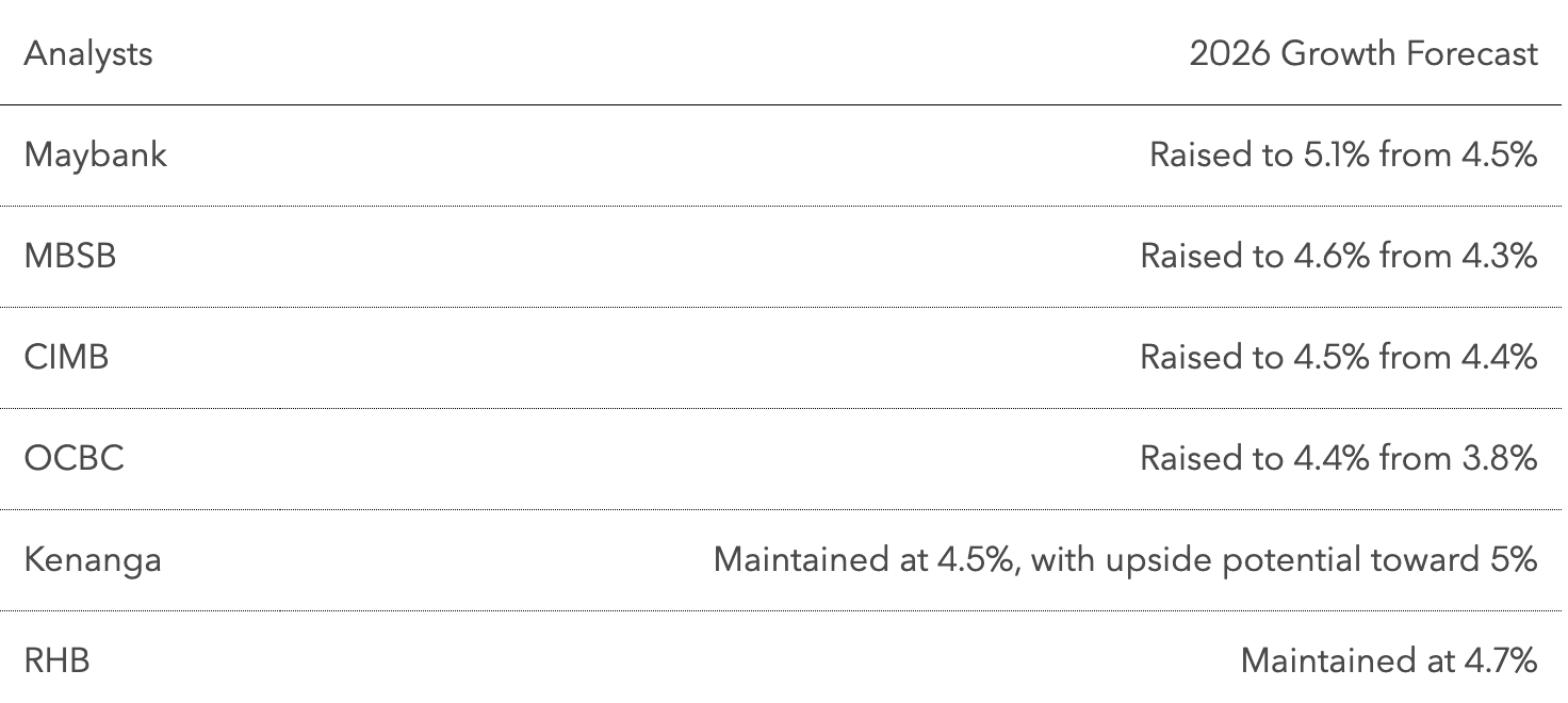Lembaga keuangan besar seperti Maybank Investment Bank Bhd, MBSB Investment Bank Bhd, dan RHB Bank Bhd memperkirakan pertumbuhan Produk Domestik Bruto (PDB) Malaysia akan menembus target pemerintah yang berada di angka 4% hingga 4,5% untuk tahun 2026. Sementara itu, CIMB Bank Bhd dan OCBC menaikkan estimasi mereka ke batas atas rentang tersebut. Bahkan, Kenanga Investment Bank Bhd melihat adanya "potensi kenaikan menuju 5,0% jika momentum saat ini terus terjaga."