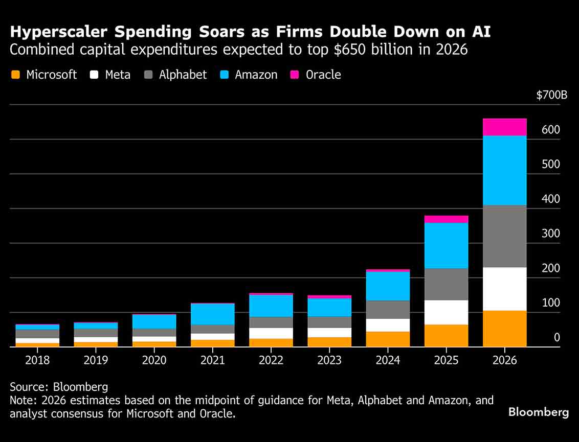 Kali ini, kelangkaan tersebut berasal dari pergeseran industri memori menuju AI. Meta Platforms Inc., Microsoft Corp., Amazon, dan Alphabet menggelontorkan dana fantastis untuk pusat data yang dapat melatih dan menampung algoritma AI, meningkatkan anggaran dari US$217 miliar pada 2024 menjadi sekitar US$360 miliar tahun lalu — hingga diperkirakan US$650 miliar pada 2026.
