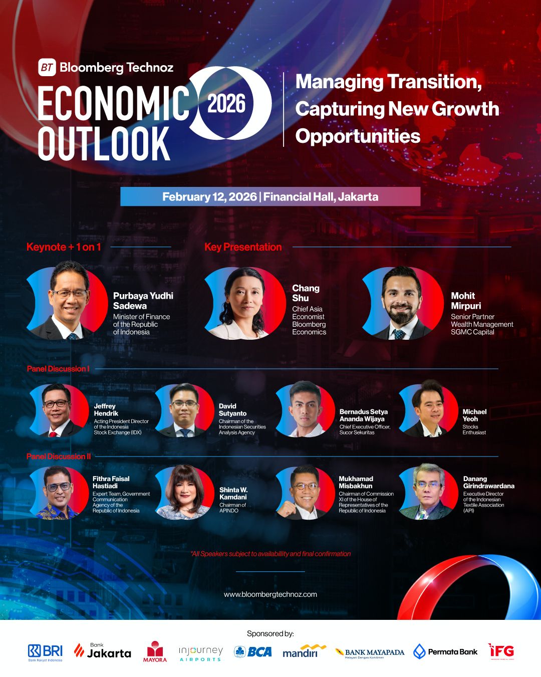 Bloomberg Technoz Economic Outlook 2026 menghadirkan pembicara dari Indonesia dan internasional yang akan berbagi perspektif strategis mengenai dinamika ekonomi global, kebijakan fiskal dan moneter, serta tantangan dan peluang ekonomi Indonesia ke depan.