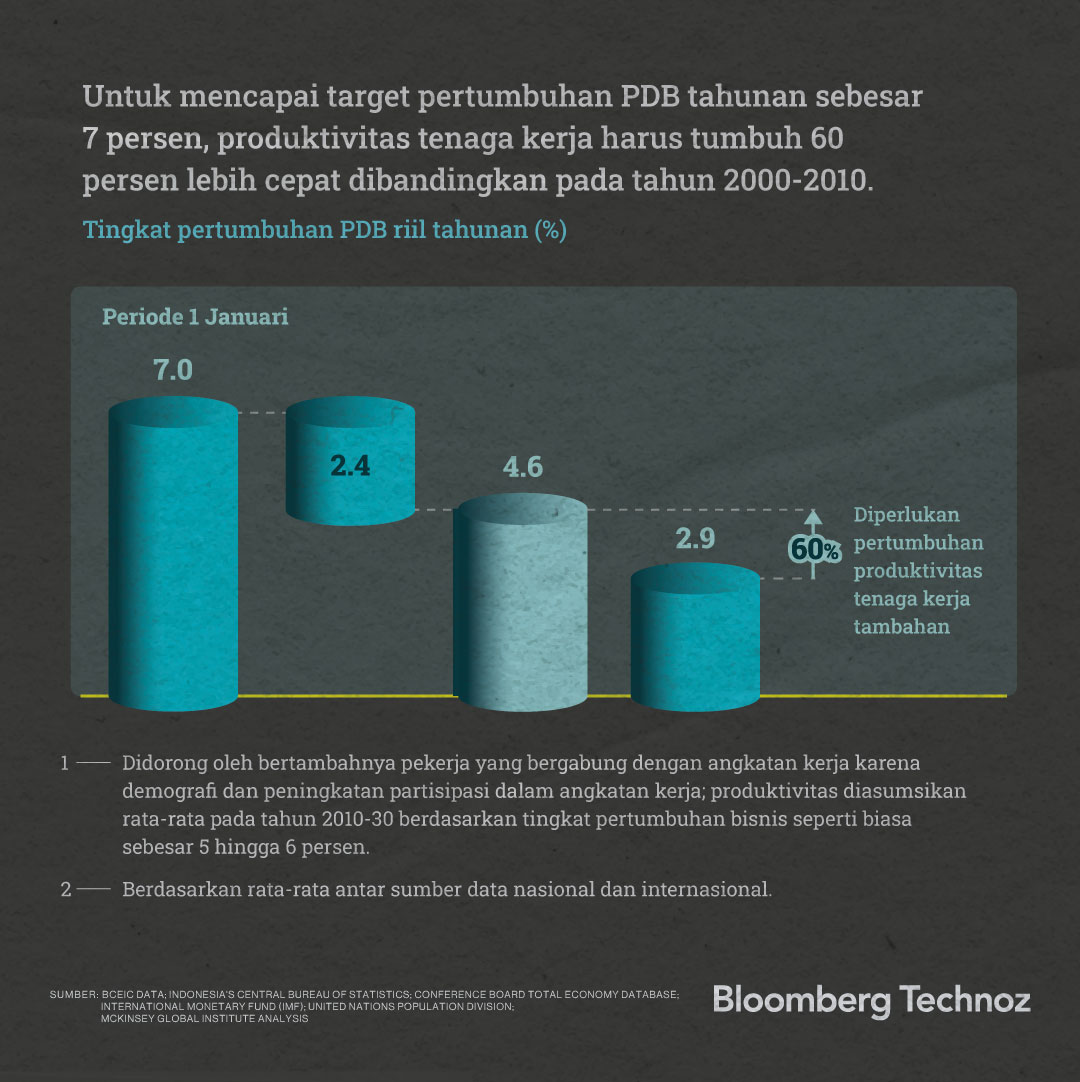 "Kinerja ekonomi Indonesia cukup baik dalam hal produktivitas pekerja, yang menyumbang lebih dari 60% terhadap pertumbuhan ekonomi. Namun analisis kami menunjukkan, Indonesia harus menaikkan pertumbuhan produktivitas sebanyak 60% dari level 2000-2010 jika ingin mencapai pertumbuhan ekonomi 7%," ungkap riset McKinsey.
