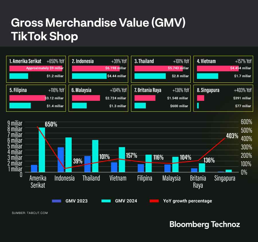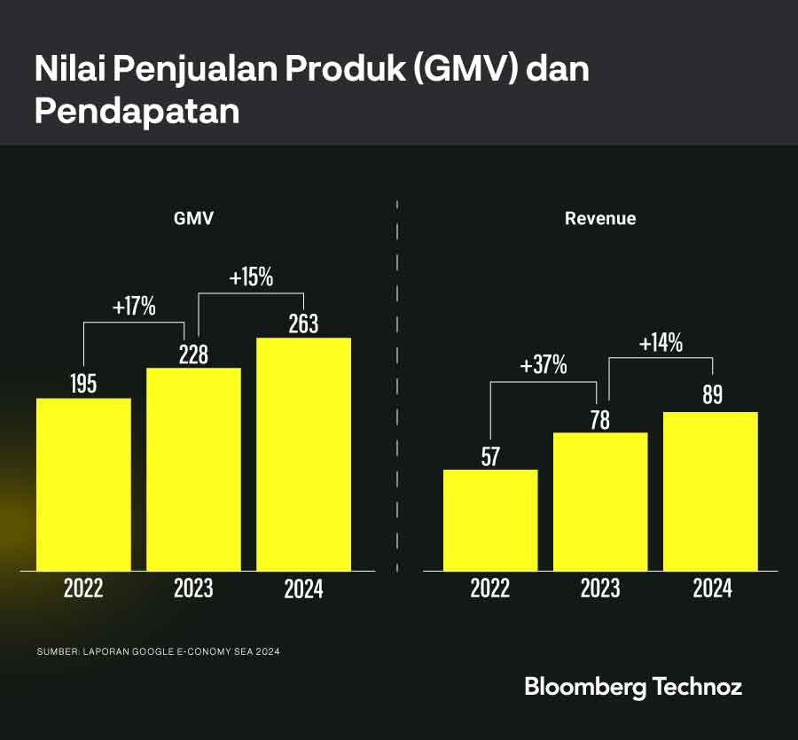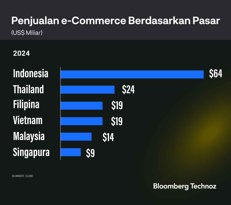 Pada 2024, pasar e-commerce Indonesia diperkirakan bernilai US$ 64 miliar. Thailand berada di peringkat kedua dengan jarak yang sangat jauh yaitu 'hanya' US$ 24 miliar.