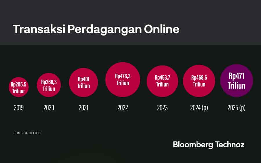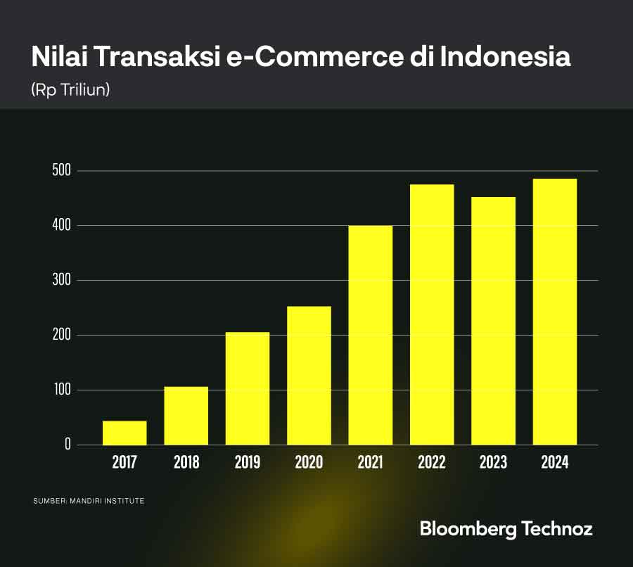 Mengutip laporan berjudul Cashing in on the Digital Boom keluaran Mandiri Institute, nilai transaksi e-commerce di Indonesia pada 2024 diperkirakan mencapai Rp 487 triliun. Tumbuh 7,27% dibandingkan 2023.