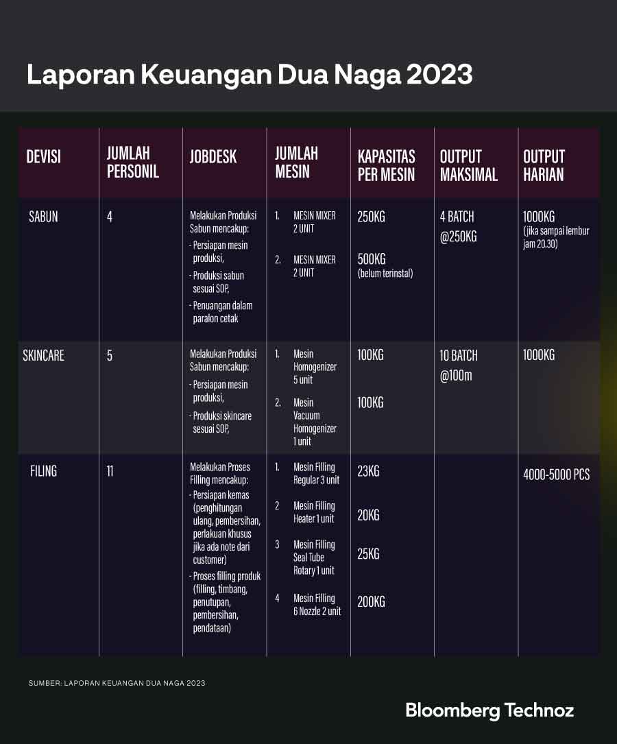Jadi, mereka yang berminat untuk membuat merek kosmetik sendiri bisa menggandeng Dua Naga sebagai pemasok. Perusahaan ini memiliki lebih dari 500 tenaga ahli yang berpengalaman di bidangnya di Korea Selatan, Prancis, dan lain-lain. Produksi per hari mencapai lebih dari 180.000.