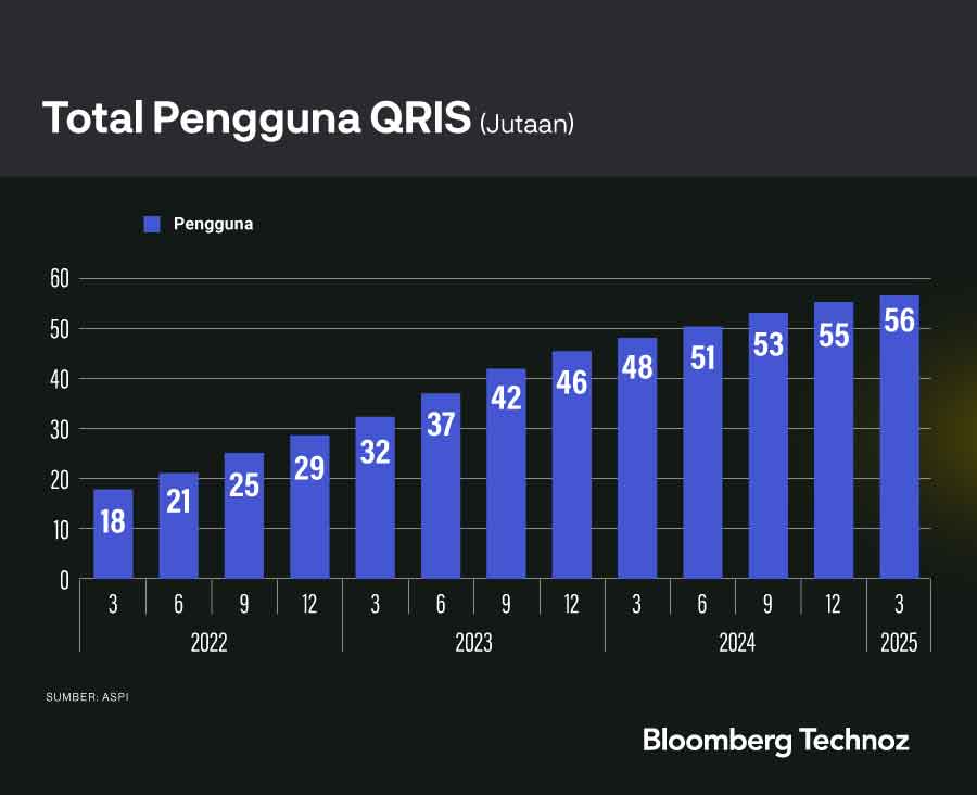 Pada kuartal I-2025, Asosiasi Sistem Pembayaran Indonesia (ASPI) mencatat pengguna QRIS sudah mencapai 56 juta. Naik 14,3% yoy.