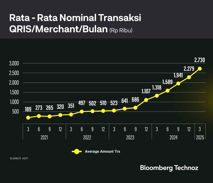 Sementara rata-rata transaksi QRIS per merchant per bulan pada kuartal I-2025 adalah Rp 2,73 juta. Melonjak 107,13% yoy.
