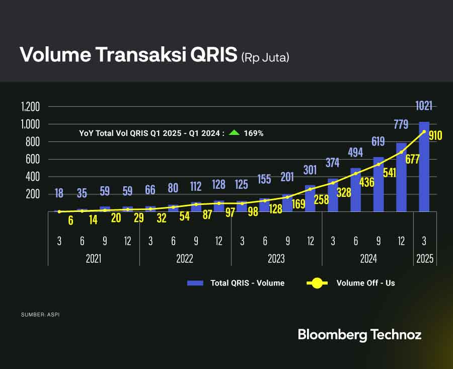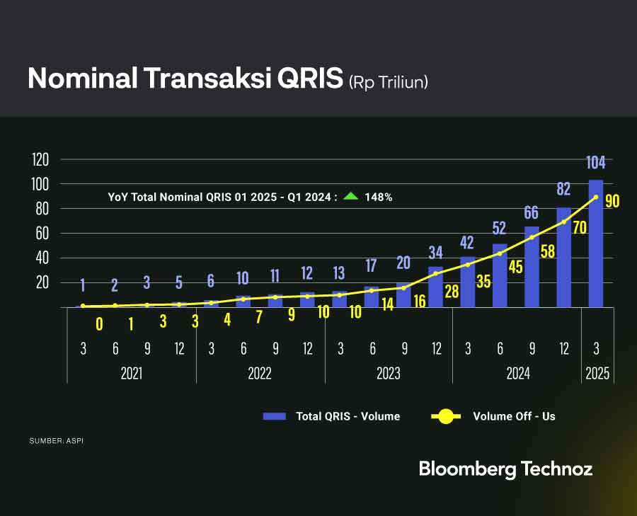 Total volume transaksi QRIS per kuartal I-2025 adalah 1,02 miliar atau melesat 169% yoy. Sedangkan nilai transaksi mencapai Rp 104 triliun atau tumbuh 148% yoy.