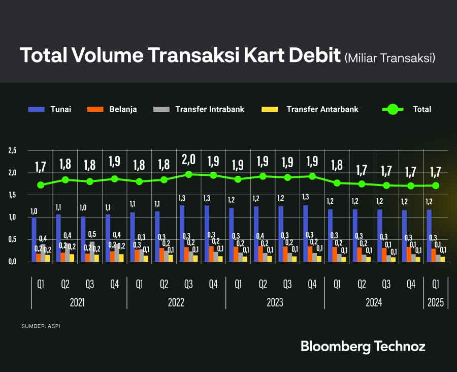 Di sisi lain, transaksi dengan kartu ATM/debet makin kurang populer. Data ASPI menunjukkan, total transaksi dengan kartu ATM/Debet per kuartal I-2025 adalah 1,7 miliar. Dalam setahun terakhir, angkanya relatif tidak bergerak alias stagnan.
