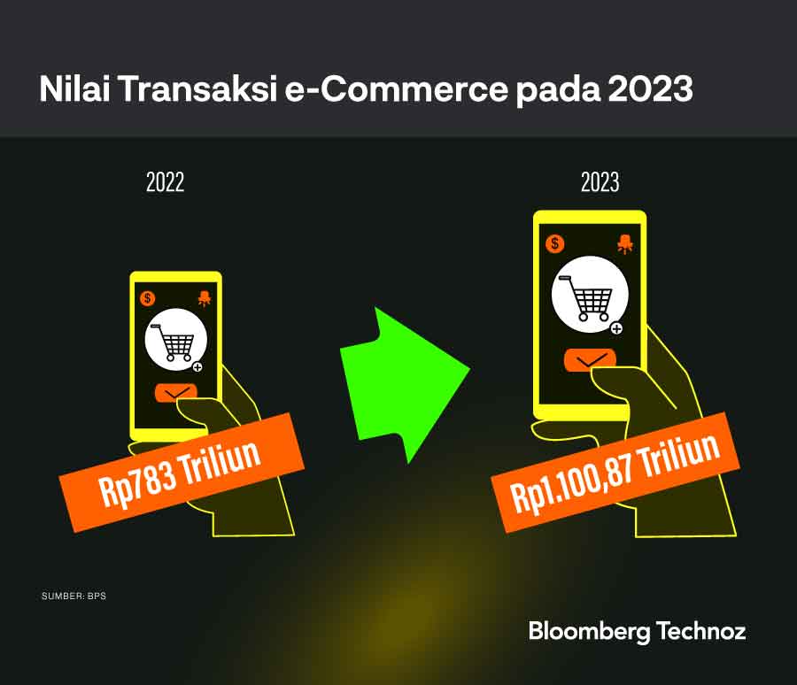 Nilai transaksi e-commerce pada 2023 adalah Rp 1.100,87 triliun. Melonjak 40% dibandingkan 2022.